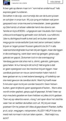 Wij hebben zelf katten die buiten lopen en ik ben regelmatig in gesprek met de buren of ze er geen overlast van hebben. Zou dat zelf namelijk verschrikkelijk vinden. Een kat opvoeden is veel moeilijker dan een hond en bijna niet te doen. Een van de buren vond het wel vervelend dat ze in zijn tuin kwamen dus in overleg heeft hij ook zo'n piepend ding in z'n tuin gezet. Sindsdien gaan de katten niet meer zijn tuin in. Voor het geval dat ze er toch nog in komen mag die van me met een schoen of tuinslang erachteraan, ze moeten het toch leren 😂 we zorgen er zelf ook voor dat onze tuin aantrekkelijk blijft voor ze, dus kattenhuisje om te schuilen, drinken buiten, etc.