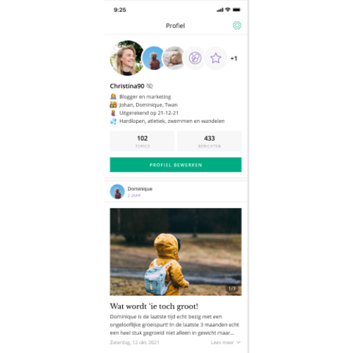 - Personaliseer je profiel met een profielfoto, bio en je zwangerschap/kind(eren).