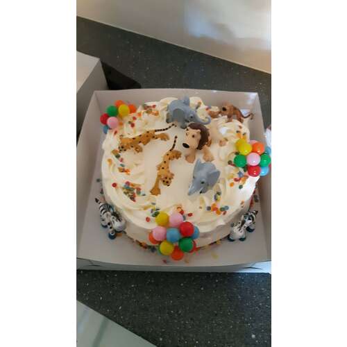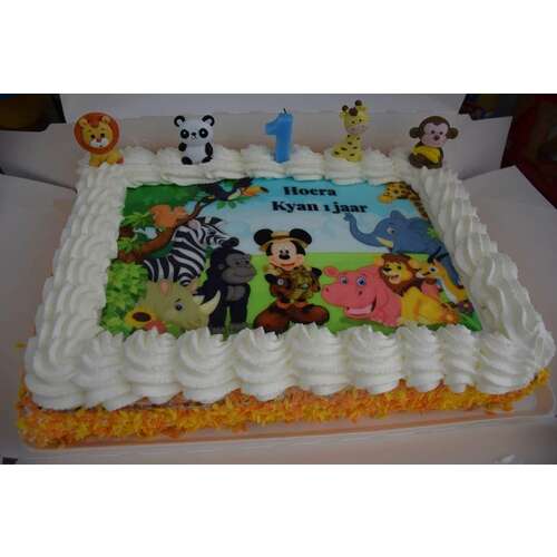 Als taart een slagroomtaart en daar diertjes opgedaan (gekocht bij de big bazar).