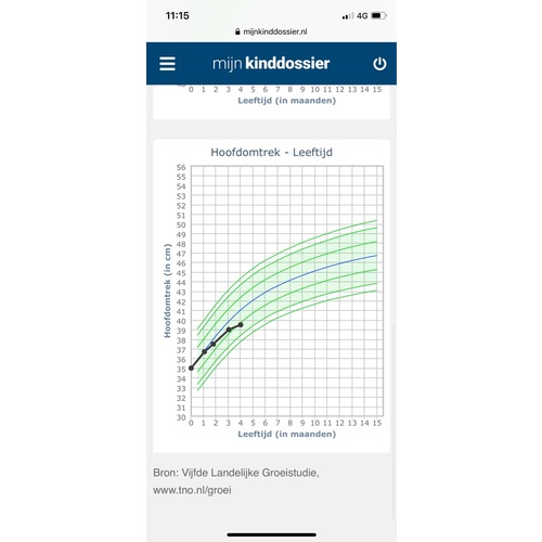 Hier geen afbuigende groei (wel onder gemiddeld, de groene lijn onder de blauwe die hij wel volgt tot nu toe). Maar wel een bijna dichte fontanel. 😢 Maak me ook enorm zorgen, ondanks dat het allemaal best goed kan uitpakken.