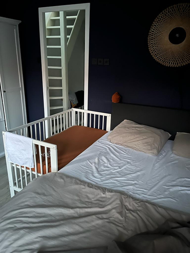 Wij hebben rond die tijd het ledikant pal naast ons bed gezet met zijn matras op gelijke hoogte met dat van ons. Soort co-sleeper idee, alleen dan kan het ‘hekje’ niet omlaag. Toevallig van de week het ledikant naar beneden gezet ivm veiligheid (hij is 9 maanden) maar het staat nog wel naast ons bed.