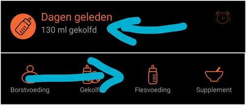 Als je in het startscherm op de tekst van de voedingsbanner tikt komen er icoontjes waarmee je o.a. flesvoeding in kan voeren. Mijn tracker staat in nachtmodus, vandaar de donkere achtergrond.