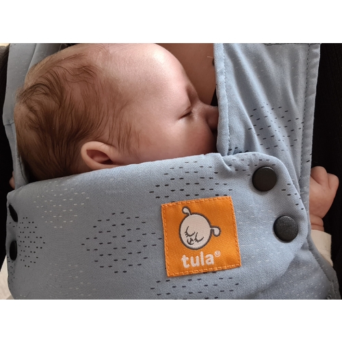 Had eerst een tula standaard en daar moest een insert bij in zodat hij hoger zat en heb nu eentje die is gelijk vanaf de geboorte te dragen de tula explore en daar zit hij in zoals op de foto. Hij is 8 weken en denk ook zo iets als 4,5 kilo en 55 cm