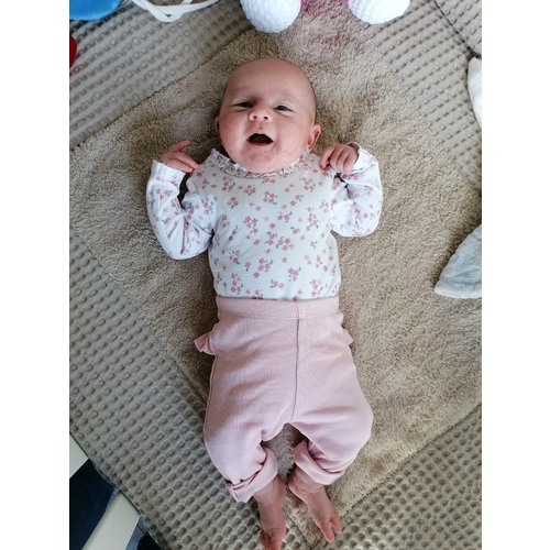 Ons meisje van 5.5 week oud. Sinds de geboorte spuugt ze best veel en drinkt de fles bijna nooit helemaal leeg. Gelukkig groeit ze goed. Maar omdat ze zo wrinig drinkt komt ze vaker voor een voeding. Dus helaas nog niet echt een ritme of lekker doorslapen in de nacht. Krampjes gelukkig weinig last van. Verder een vrolijk meisje.
