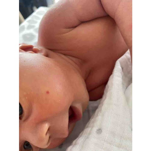 Het lijkt op een aardbeienvlekje, kan ook nog groter en dikker worden. Meestal voor het 10e levensjaar verdwijnen ze weer.
