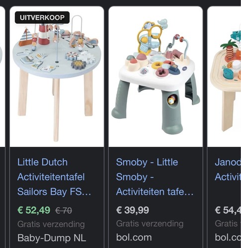 Bedoel je zo鈥檔 activiteitentafel als op de foto? Dan 100% daarvoor gaan. Wij hadden zo eentje als van Smoby, daar konden de pootjes onderuit. Dus ook heel geschikt voor liggen op de buik of voor op de knie毛n.
