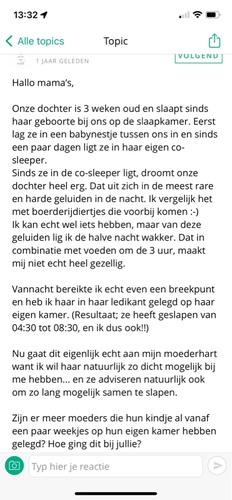 Klinkt als een boertje inderdaad. Onze dochter sliep de eerste weken op mijn buik ‘s nachts, nu (ze is 10 weken) geen last meer van