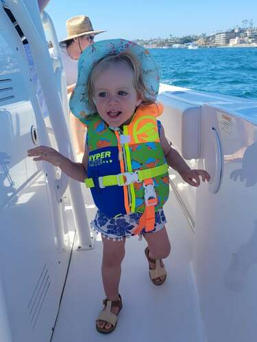 Ik ben opgegroeid op een boot, en mijn jongste zusje had altijd een zwemvest aan met een lus eraan. Daaraan deden mijn ouders een touw/koord en bonden dat aan een vast punt op de boot. Zo kon ze toch vrij haar gang gaan aan boord en hadden ze minder hun handen vol.
