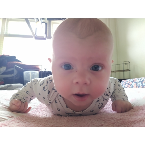 Ik ben het echt leuk voor der gaan maken en elke dag iets langer. Hier werkt een buikligkussen goed of een ander kussentje, gerolde handdoek voldoet ook prima. Hierdoor is het minder zwaar. Ze krijgt voor speelgoed voor haar. Ook doe ik bij elke verschoning de broek en sokjes terug aan op buikligging. Inmiddels blijft ze vrolijk liggen en gaat ze de armen steeds meer gebruiken. We zitten nu op 10/15 min speeltijd op de buik. Morgen is ze precies 15 weken.
