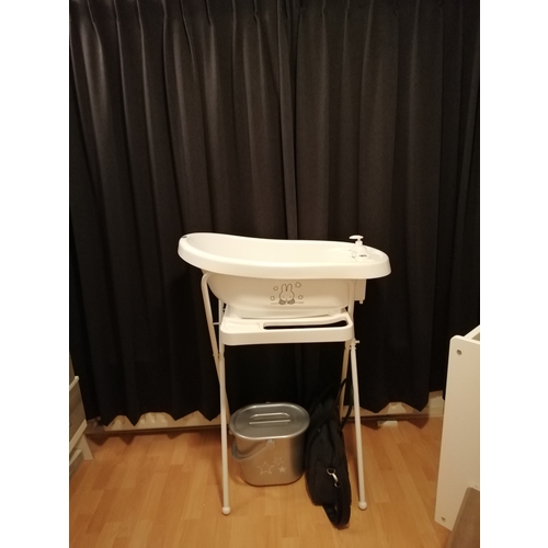 Bebe jou badje met standaard en pompjes erin, ideaal! Lekker de handen vrij en werken op goede hoogte. Staat in de badkamer, zodat we het badje kunnen vullen met water uit de douchekop en weer makkelijker leeg kunnen laten lopen.