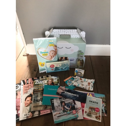 1 luier van pampers, billen zalf of sudocreme, thermofles of nachtlampje, boekjes en folders