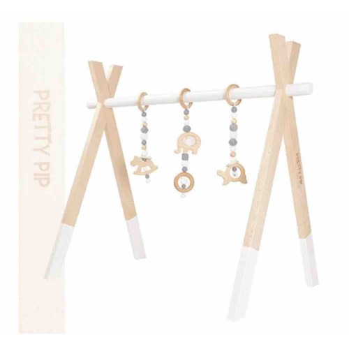 Zo'n houten is mooi en leuk maar als ze ouder wordt gaan ze ravotten. Die van ons was een stoffen met van die zacht beschermde stokken. Als je zag hoe ze daar uiteindelijk mee te keer ging denk ik dat zo'n houten ding toch minder lang mee gaat omdat je hem eerder weg moet doen omdat ze zich kan bezeren. En je hebt ook zachte babygyms die wel in je interieur passen. En ook heel handig ze passen in je box ja en heb je ze niet nodig schuif je ze zo onder de box. En je hebt gelijk een mooi kleedje waar ook vaak leuke speeltjes en ontdekkingen op zitten. Succes!