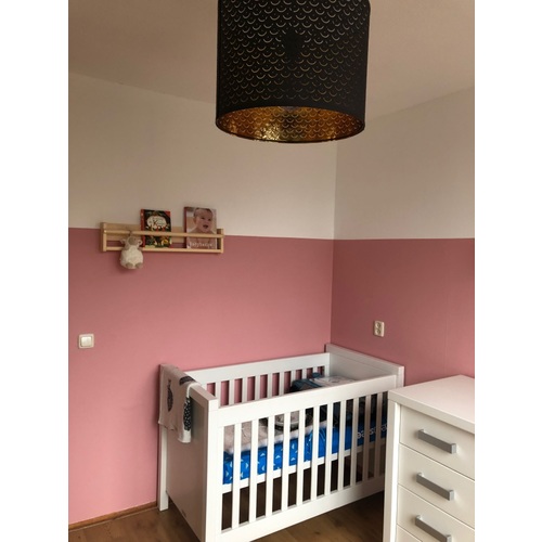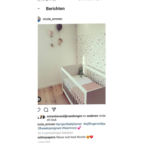 Ik zal straks even voor je kijken :) heb de potten nog staan. De andere wand hebben we zit gehouden en door middel van kleine muurstickers (hartjes) beplakt. Ben er heel blij mee! 😊
