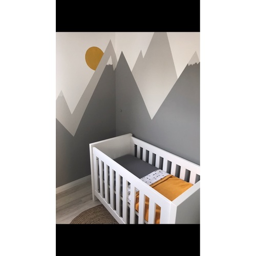 Ik wilde iets wat zonder extra kluskosten vrij tijdloos is, dus we hebben expres geen behang speciaal voor baby/kinderkamers. We passen onze accesoires deels aan op de leeftijd van het moment.