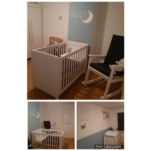Wij wilden eerst me too you beertjes, uiteindelijk vanaf gestapt en heel rustig gehouden met 3 Nijntje afbeeldingen.. dus thema is wel een Nijntje maar niet dat het overheersend is. Vond het vooral belangrijk dat het een kamertje werd die rust uitstraalde. Nu nog niet helemaal af, nog wat dingen ophangen en bijwerken en aankleden.