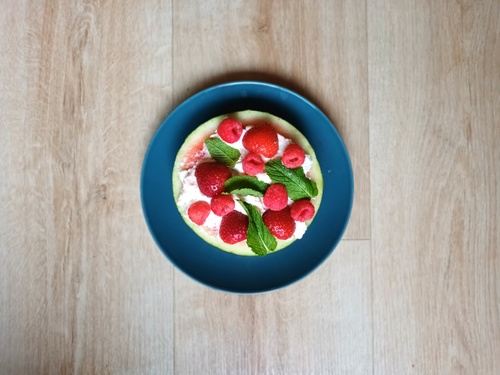 Voor mijn eigen verjaardag had ik watermeloentaart gemaakt. Watermeloen doorsnijden in platte stukken. Kokosroom (kokosmelk laten afkoelen in de koelkast en alleen de room gebruiken) erop smeren (ik denk dat griekse yoghurt ook kan) en daar fruit en muntblaadjes op ter decoratie.
