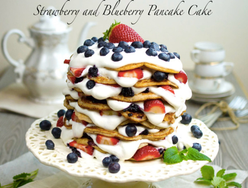 Ik maakte “cake” van gezond bananenbrood, besmeerd met Griekse yoghurt en aangekleed met blauwe bessen en frambozen.