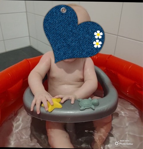 Ah ja, nog even het douchen volhouden en als hij goed kan zitten weer lekker in bad. Wat ik ook heb gedaan trouwens is een enkele keer de badring in het opblaasbadje, plakt niet! Dus als ze heel erg leunen dan vallen ze wel om. Maar als je erbij zit… hier ging het goed! Ik zoek even een fotootje op.