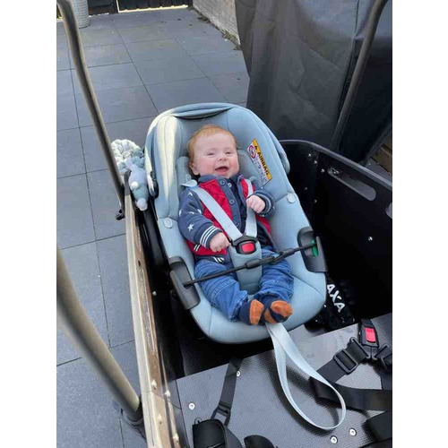 Hier precies zo gedaan. Maxi cosi moet wel vastgemaakt worden met de Elastieken die erbij geleverd worden. Anders kan de maxi cosi er zo uitvliegen als je een hoge hobbel neemt. Die Elastieken moeten om die knoppen heen aan de zijkanten waarmee je die draagstang van de maxi cosi naar beneden of omhoog doet. Zo wordt de maxi cosi tegengehouden bij een hobbel, (of erger een botsing). Ik zag hier een foto waarbij de Elastieken vast zitten bij de beentjes, mar dat zou ik persoonlijk niet doen. De maxi cosi kan dan namelijk alsnog voorover kiepen, waardoor je kind ondersteboven ligt en op z'n hoofd belandt. (en dit is niet bedoeld als commentaar. Ik ben ook geen heilige (Elastieken al een paar keer vergeten vast te maken terwijl ik op een gewone fiets fietste))