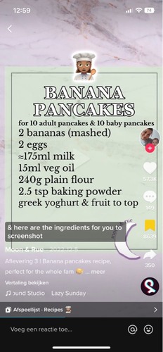 In het begin alleen banaan en ei, later ook havermout, bloem of brinta erdoor. Ligt er een beetje aan voor welke maaltijd het is. We hebben meestal wel wat in de vriezer liggen omdat de eieren op moesten of omdat er fruit/groente overrijp was.