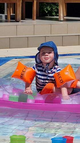 Wij zijn afgelopen weekend gaan zwemmen met de puddle jumper voor onze dichter van 20 maanden. Ze is wel redelijk groot voor haar leeftijd maar niet heel breed, ze is rond de 13 kg schat ik.