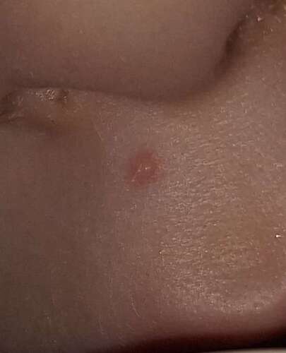 Het zit aan de binnenkant van zijn beentje waar zijn luier normaal overheen zit. Dus ik denk dat dat het niet is. Het is ook echt een blaasje gevuld met vocht wat erop zit!