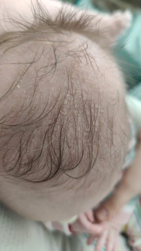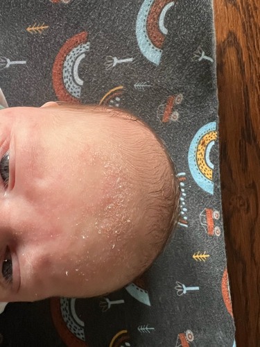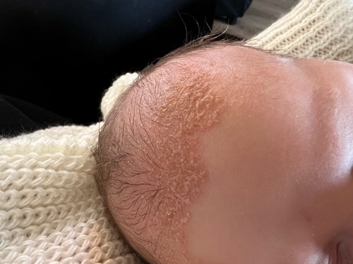 Ik denk dat het een vorm van eczeem is. Ik herken het van Tiny Todd Instagram van een jongetje dat Mason heet die dezelfde textuur op zn voorhoofd had.