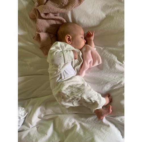 Foto is op mijn bed (2x2m) en ik stond er naast mij. Spijkerbroek aan te trekken hoor😅. Niet dat je denk dat zo zo slaapt. Konijn heeft ze alleen overdag, savonds een doekje. Ze heeft geen speen en vindt dit fijn!