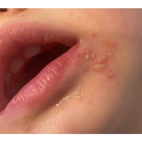 Sinds vanmorgen heeft onze zoon deze blaasjes bij zijn mondje. Omdat het erger lijkt te worden gaan we morgen de huisarts bellen. Hebben jullie enig idee wat dit kan zijn? Hij lijkt er verder geen last van te hebben.