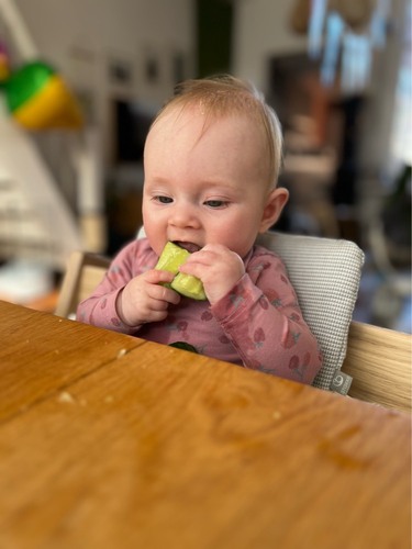 Gister ‘beet’ ze een stuk komkommer af. Ik moest me echt even inhouden om niet te flippen. Maar vervolgens werkte ze het stuk keurig door haar mond heen en spuugde ze het weer uit. Ik vertrouw op haar en doe natuurlijk wel zo veilig mogelijk de dingen aanbieden.