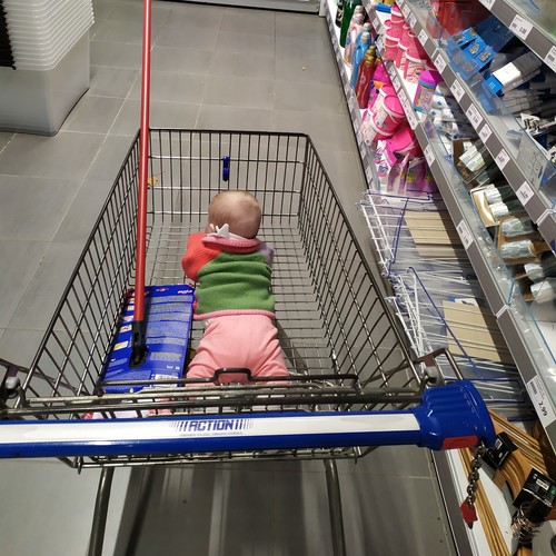 Hier gaat de kleine of mee in de draagzak, of ik pak zo een kar met een speciaal opzetje voor de maxi cosi. Als ik niet zoveel nodig heb neem ik de kinderwagen mee met een grote tas aan de tassenhaken en een zelfscanner zodat ik alles gelijk in de tas kan stoppen