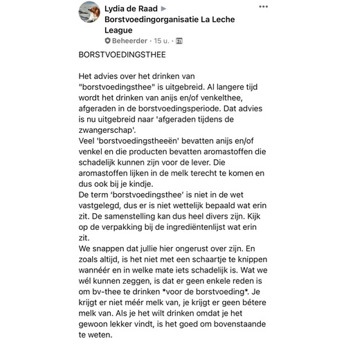 Ik vond het op zich al duidelijk, maar hier nog via de KNOV. Het staat nu dus ook in ZwangerHap en Voedingscentrum. https://www.knov.nl/actueel-overzicht/nieuws-overzicht/detail/borstvoedingsthee-afgeraden-vanwege-mogelijk-gezondheidsrisico-voor-baby-s/3063