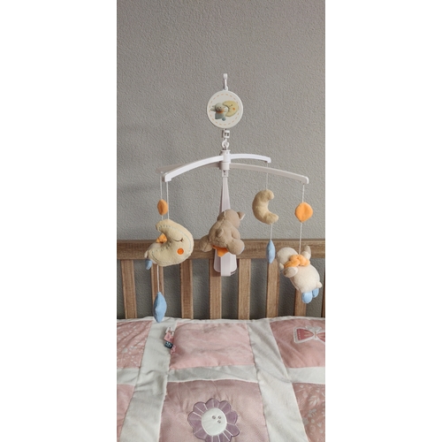 Wij hebben de tiny love magical tales. Werkt op batterijen kan met muziek aan maar ook alleen ronddraaien zonder geluid.