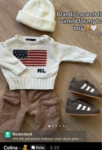 Ik zou persoonlijk nooit meer dan 1 maat vooruit kopen, aangezien je geen idee hebt hoe de groei van je kindje gaat verlopen. Kleding mag zeker stylish zijn, maar hou ook rekening met wat comfortabel is bij een baby. Sneakers zoals op de foto zijn pas geschikt als je kind kan lopen vanwege de stugge zool. Je hebt wel leuke sneaker stijl slofjes van nike en adidas. Ik koop op vinted voor mijn zoontje vooral jeans van Z8 en Noppies. Babystyling heeft ook hele leuke neutrale cargobroekjes. Bovenkleding koop ik Zara, H&M, Zeeman, JBC en Hema (daar wel meer kleurrijke kleding).