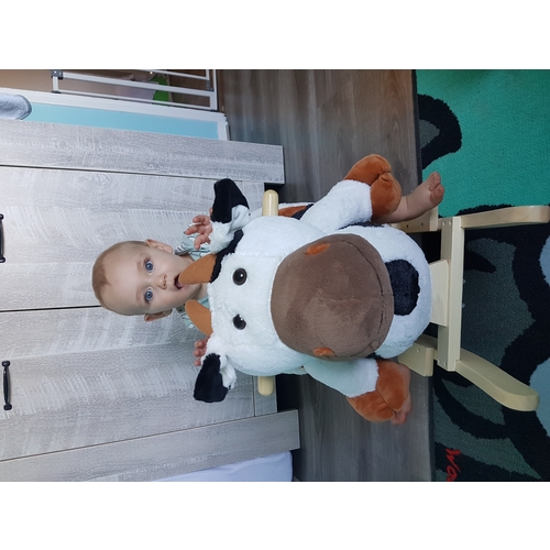 Wij hebben een hobbelkoe (nog geen 1 jaar 27/8 pas) maar dit vind hij zo leuk zodra hij er zelf op en af kan denk ik dat gij er niet meer af te keijgen is super leuk je hebt ook meerdere diersoorten