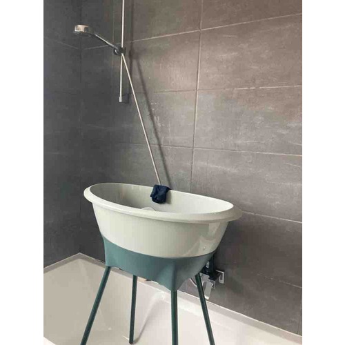 Ik zet ons badje altijd in de douche, past precies. In het vorige huis kon hij precies boven de wc staan zodat ik hem daarin leeg kon laten lopen. De doucheslang redde het precies tot het badje voor het vullen.