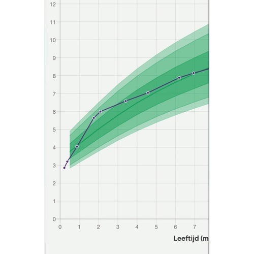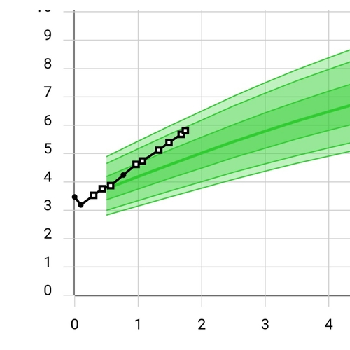 Geen zorgen hoor! Dit is de groeicurve van mijn oudste. Zoals je ziet schoot hij in het begin ook omhoog, maar trok het daarna weer hij richting gemiddeld. Ik begreep toen van het consultatiebureau dat dit bij borstvoeding heel normaal is. Kinderen die flesvoeding krijgen groeien op een andere manier.