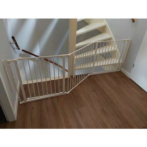 Wij hebben een opvouwbaar traphekje van Babydan. We hebben er twee tweedehands gekocht en aan elkaar vast gemaakt zodat hij lang genoeg was.