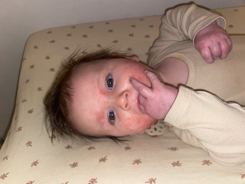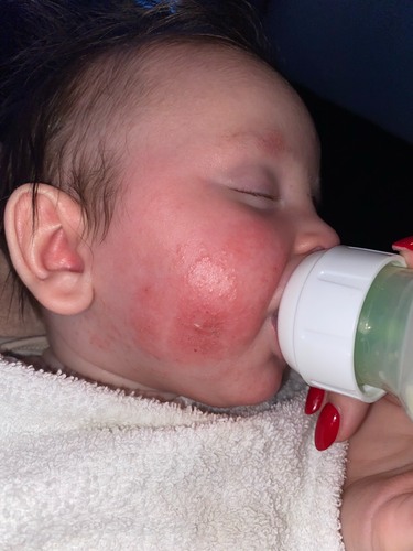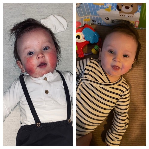Even update. Na jullie berichtje begonnen met koemelk vrije voeding. Op de foto zien jullie verschil! Links is na een week hormoonzalf smeren en rechts na 5 dagen andere voeding. Van de week maar even de huisarts bellen om dit te tonen. We hebben een heel ander kind. Zoveel vrolijker!