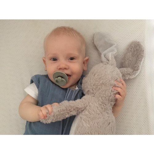 Vanaf 4 maanden slaapt hij met dit konijn/haas. Daarvoor keek hij niet op of om van knuffels. Redelijk groot maar het is echt zijn állerbeste vriend. Hij kletst altijd even tegen zijn knuffel voor hij in slaap valt, zo loef!