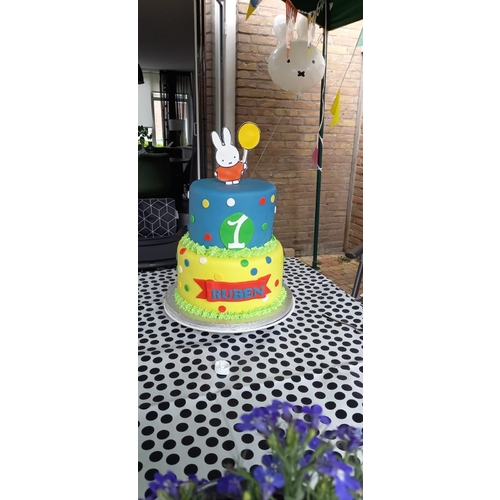Hier bij de eerste verjaardag ook versiering gekocht bij de Hema en dieren op de taart. Van die slingers met stippen er op en alles. Ik gebruik het nog steeds.