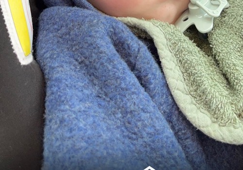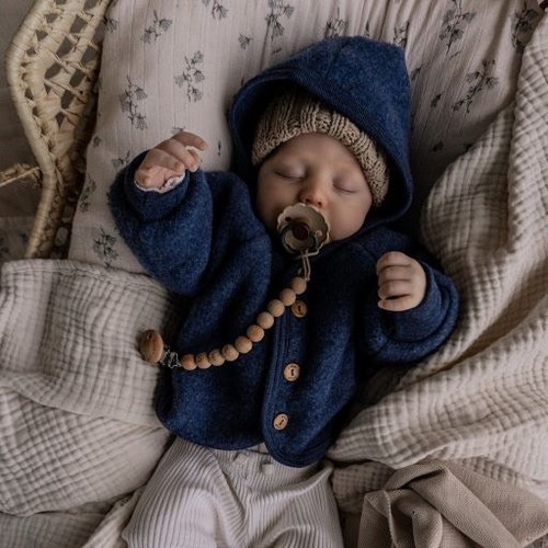 hier was mijn zoon 4 maanden oud, de jas was in het begin veel te groot maar dat hoort bij deze jassen. De mouwen laten zich makkelijk omslaan en hij heeft er bijna een jaar mee gedaan! Hij had dus maat 62/68 omdat hij hem pas ging dragen met 3 maanden, daarvoor had ik een andere jas en vestje