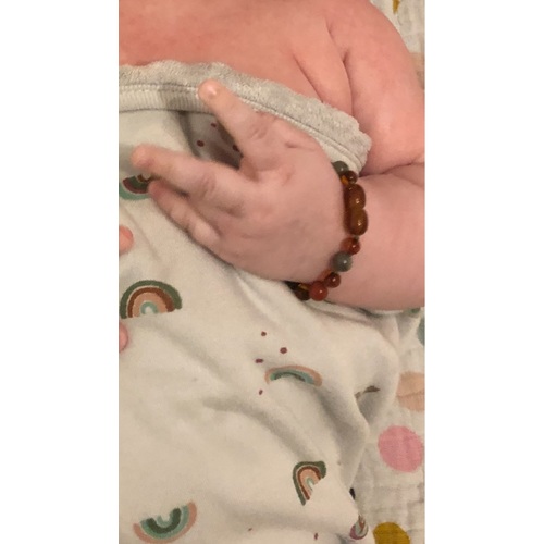 Kun je geen barnsteen vlak bij het bedje zetten? Ipv armband . Kijk even op de site van BryOnly......niet bij de grote bedrijven die vaak nepstenen verkopen.
