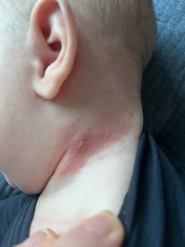 Mijn zoontje heeft ook eczeem in zijn nekje en in zijn gezicht. Het zijn minder duidelijk afgebakende plekken als van jouw kindje, maar verder ziet het er wel ook zo uit. Hier begon het al met 2 maanden en hij is nu 6,5 maand. Ik ben er nog niet uit of het door voedsel komt of niet (ben allerlei diëten gaan proberen maar ik zie nog geen heel duidelijk verband).