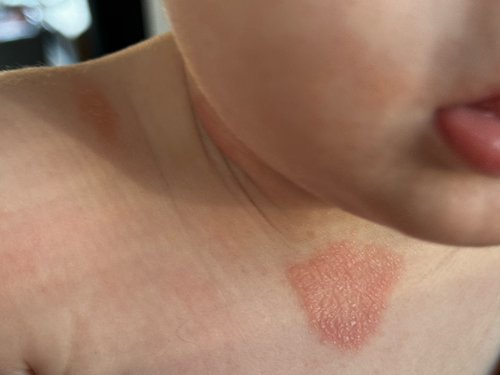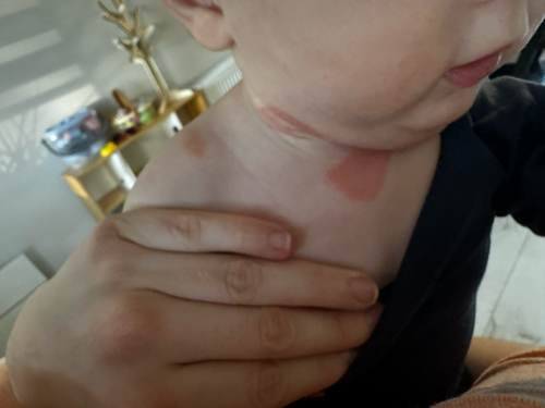 Het ontstond hier voor het eerst ook in de nek bij de kraag van kleding. Maar het komt hier niet meer terug. Ze heeft nu een plekje onder haar oksel en ergens random op haar arm.
