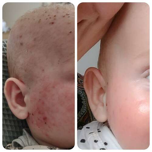 8 weken klungelen met allerlei natuurlijke middeltjes zonder 'troep', 3 weken hydrocortison (cat. 1 hormoonzalf). Kleine krabde de hele dag, eczeem over z'n hele lijf, niet meer slapen, ik niet meer slapen, hij chagrijnig en moe, niet goed groeien. Naar de kinderarts geweest, zwaardere zalf én een duidelijk smeer regime. Na 3 dagen compleet ander kind. Zie foto voor het verschil in 3 dagen voor en na de 'troep'. Dikke vette spijt dat ik mijn zoontje van nog geen 6 maanden nog relatief zo lang heb laten doorlopen en dat de huisarts ons ook steeds wegstuurde met 'hoort erbij, lekker vet houden'. Mijn advies: luister naar je huisarts, zie je in elke dagen geen verbetering, direct terug! Bij de goede behandeling zie je snel resultaat.