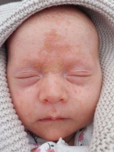 Ons zoontje had dit ook. Bleek eczeem te zijn inderdaad. Hij had er ook geen last van, tot dat zijn oogjes ervan dicht gingen zitten. Zo zielig. We hebben creme via de huisarts gekregen en werd geadviseerd om hem even niet in de draagzak te doen. Door de warmte en beetje wrijving werd het daar erger van. Het is (met een beetje geduld en veel smeren) helemaal overgegaan.