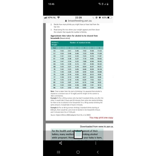 Ik had test-strips gekocht om de alcohol in mijn moedermelk te meten. Die gaven 6u na een avondje doorzakken al aan dat er geen alcohol in zat, maar heb toch weggegooid tot 19u na mijn laatste drankje. Je hebt ook bijgevoegd schema, geen idee of dat 100% klopt.