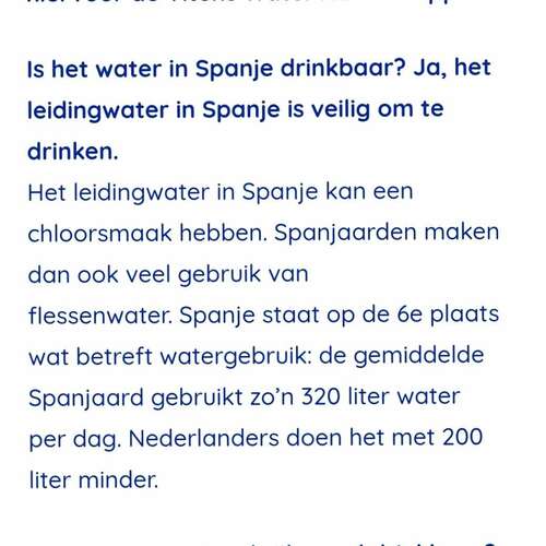 Alvast GEEN water uit de kraan in Spanje aan je baby geven! Proef er zelf ook maar eens van, je zal een chloorsmaak proeven. Wij zijn al 2 x op vakantie in Spanje geweest met onze baby en hebben daar gewoon in de carrefour het goedkoopste water gekocht. Er staan wel duidelijk een label op dat het geschikt is voor het klaarmaken van zuigelingen voeding: