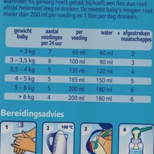 Als er word gezegd dat je zoontje bijv 180ml nodig heeft dan zijn dat 180ml water en 5 scheppen.